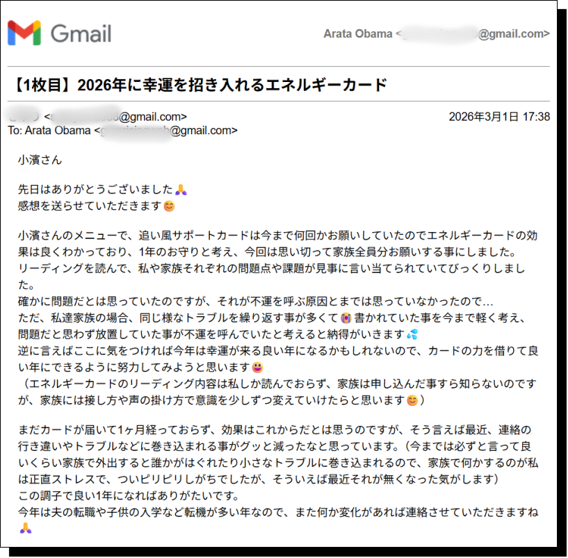 今回は、ご家族4人分のエネルギーカードのリーディング結果と、お客様から頂いたご感想のメールをご紹介させて頂きたいと思います。