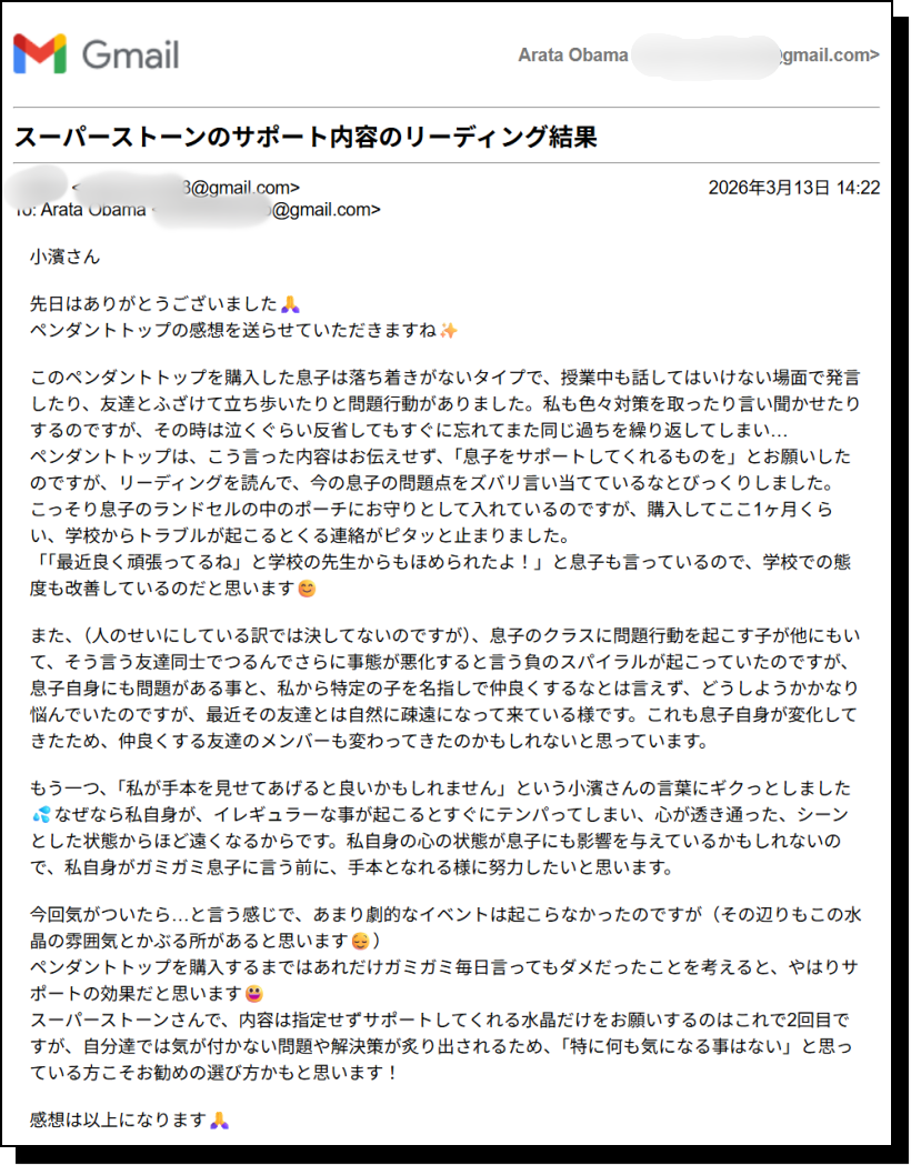ペンダントトップは、こう言った内容はお伝えせず、「息子をサポートしてくれるものを」とお願いしたのですが、リーディングを読んで、今の息子の問題点をズバリ言い当てているなとびっくりしました。