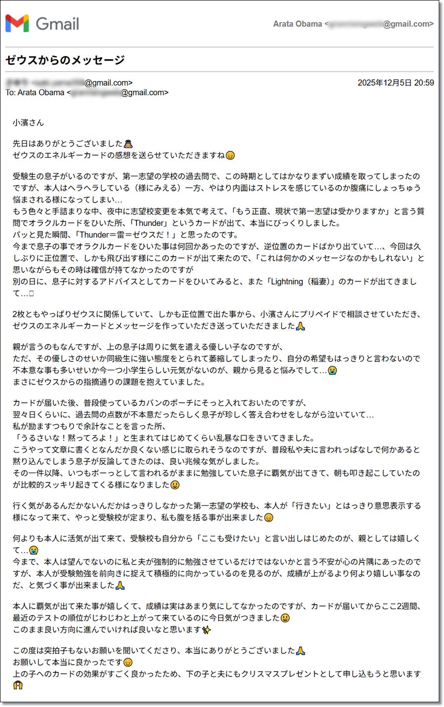 ゼウスからのメッセージのエネルギーをカードに設定し、カードを送付し、リーディング結果をメールにてお送りしたところ、後日、お客様からご感想のメールを頂きました↓