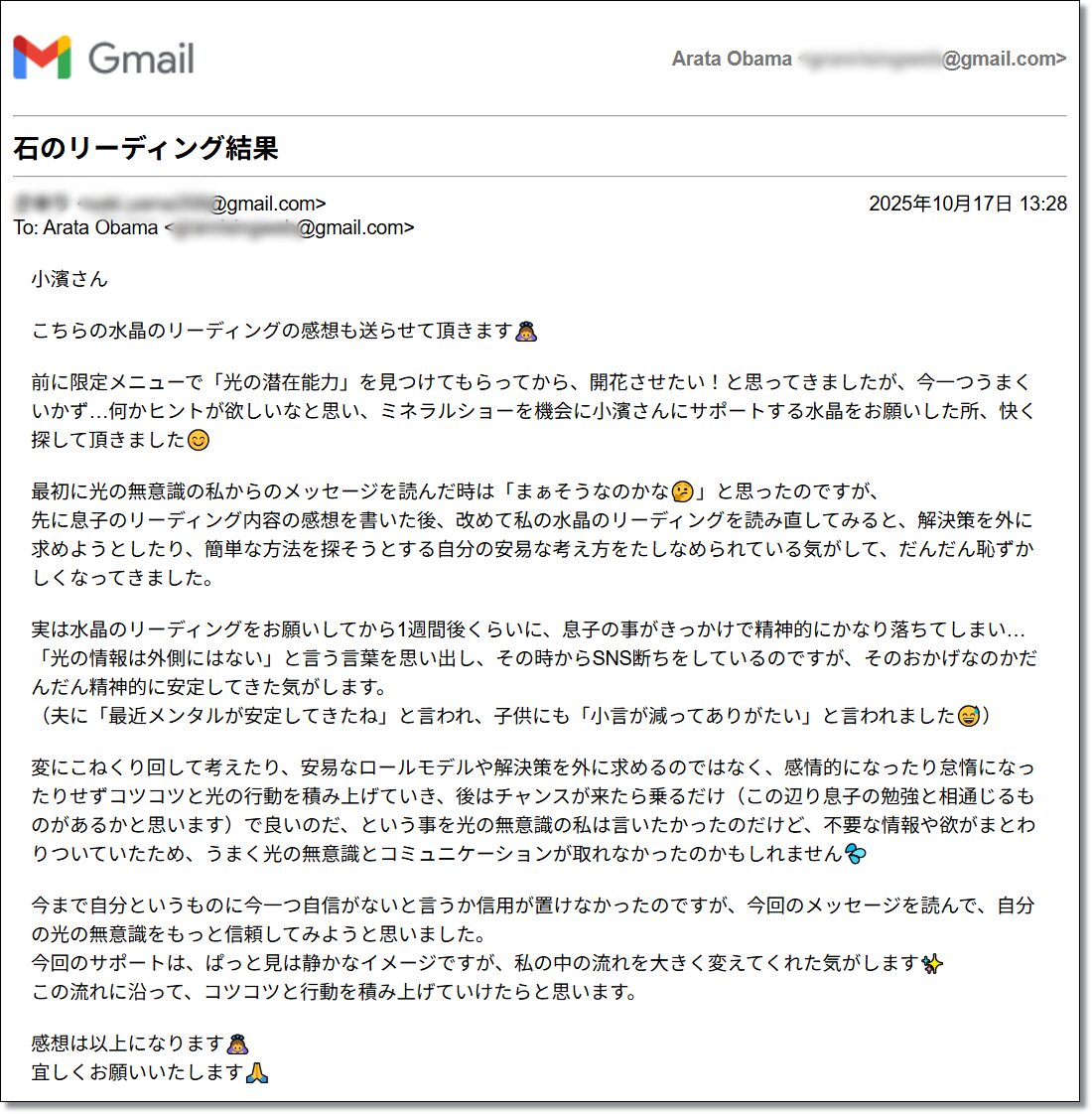 リーディング結果をお送りして1週間後、お客様からご感想のメールを頂きましたので、ご紹介させて頂きます↓