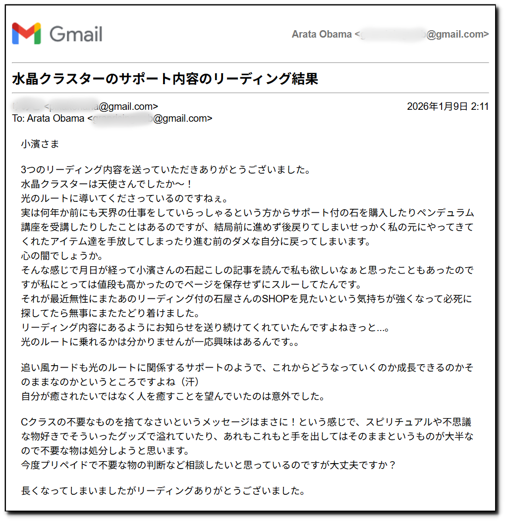3つのリーディング結果をお客様にお送りしたところ、お客様からご感想のメールを頂きましたので、ご紹介させて頂きたいと思います↓