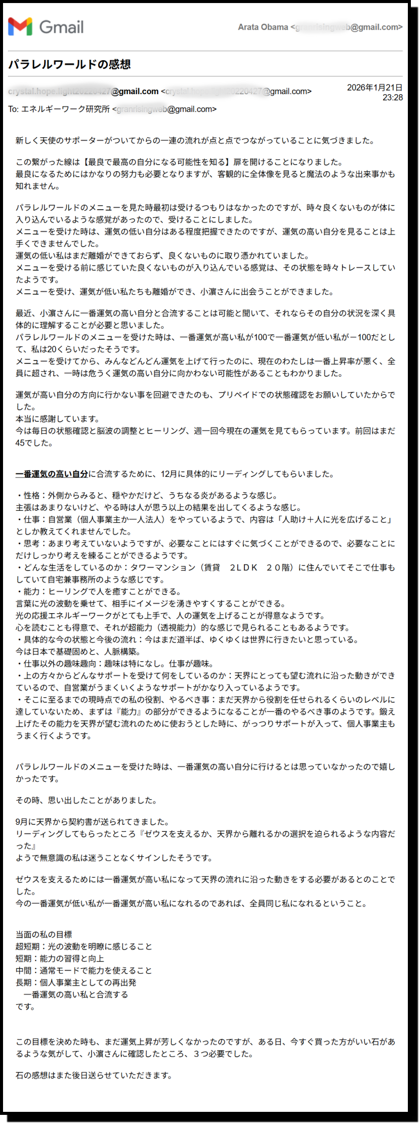 パラレルワールドのメニューを受けた時は、一番運気の高い自分に行けるとは思っていなかったので嬉しかったです。